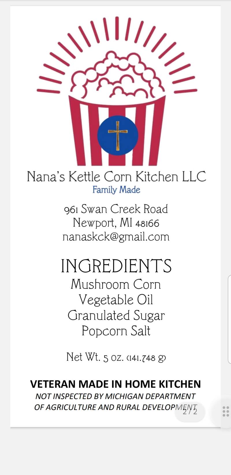 Nana's Kettle Corn Kitchen is a family-owned business located in Newport, MI. Our mission is to provide the most delicious kettle corn that brings joy to families and supports our Veterans. With a dedication to quality and customer satisfaction, we aim to be your go-to source for all your kettle corn needs.
